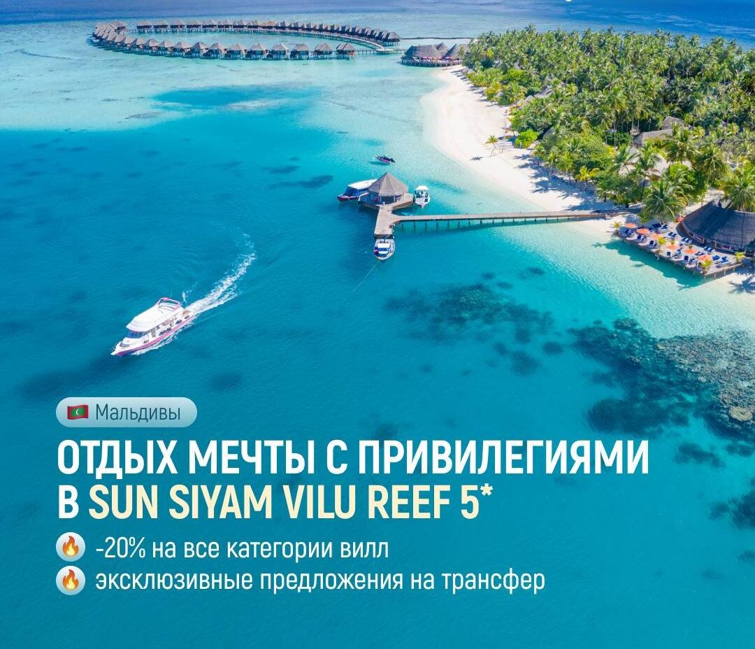 ⚡️ОТЕЛЬ ДНЯ⚡️📍🏝️🐚Мальдивы Sun Siyam Vilu Reef 5*: роскошный отдых в сердце Мальдив 🌺 Почему стоит выбрать этот курорт? • Собственный домашний риф с богатым подводным миром – идеальное место для снорклинга и дайвинга. • Романтический отдых для пар – беззаботная атмосфера, приватность и высокий уровень комфорта. • Свадебные церемонии — 2 формата на выбор: Tropical Ceremony с уютной романтикой у берега и Sunset Ceremony с премиальным декором и атмосферой закатного ужина на пляже • Эксклюзивные виллы – над водой и на пляже, с прямым доступом к океану. • Кулинарные впечатления – романтические ужины в винном погребе, гриль-деликатесы, кухня Италии и Индии, а также шведский стол с видом на океан. Как добраться? ✈ 35 минут живописного перелёта на гидросамолёте от Мале – и вы в раю! Признание на мировом уровне: 🏆 Лучший курорт с водными виллами в мире (2018) – по версии World Travel Awards. 🏆 Сертификат качества TripAdvisor три года подряд. ⚠️Спецпредложение (бронирование до 15.09):