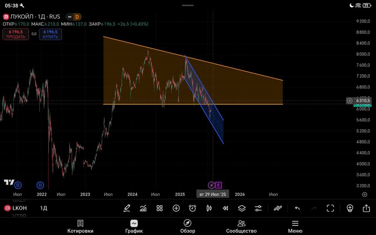 🔼Верхняя стенка канала 6310, если выйдет , может пойти к последней вершине 6975 и если обновит, то движение наверх будет продолжено. Пока что рост под вопросом.