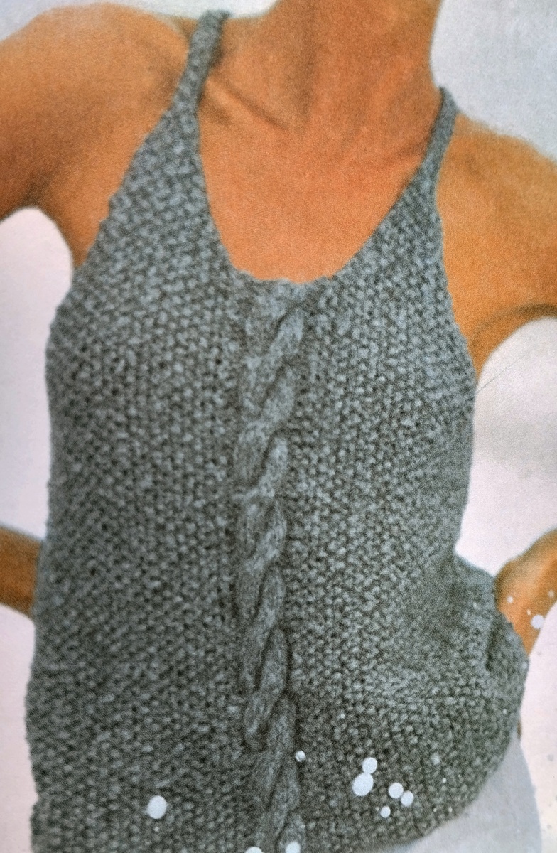 Классический топ, который не выйдет из моды никогда! В конце статьи представлена спинка изделия. Размеры: Модель подходит для фигуры с окружностью груди 81 (86, 91,96) см. Описание работы проводится для наименьшего размера, а цифры в скобках даются для более крупных изделий. Если присутствует только одна цифры, то она относится ко всем размерам. Также вам может понравится эта статья Параметры готового изделия: Материалы: Пряжа-оригинал: 4 (4, 5, 5) клуба весом по 100 г (длина нити в каждом прим. 110 м). смесовой пряжи (хлопок/искусственный шёлк/лён 6) серого цвета. Пряжа-заменитель Примечание В разделе "Материалы" цифра в кружке - 4 - обозначает маркировку пряжи (см.таблицу на с. 8). Цвет пряжи дан условно. Вы можете подбирать цвета в соответствии с вашими пристрастиями и вкусом. Перед: Нитью в два сложения наб. 70 (74, 78,82) п. Ряд 1 (по лс): 1лиц., *1 изн.; повтор. от *, пока не провяжите 29 (31, 33, 35) п., ум., 2 изн. 8 лиц., 2 изн., установите 2-й маркер, 1 лиц., ** 1 из