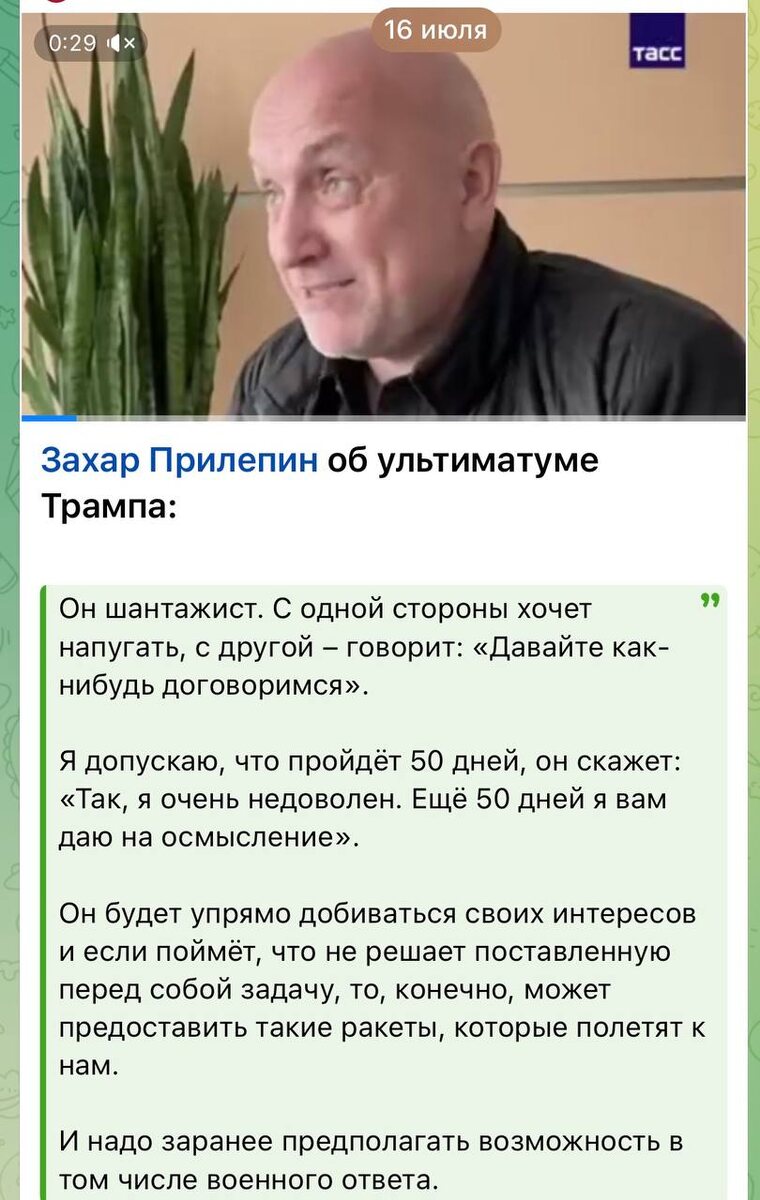 Мой комментарий от 16 июля: СЕГОДНЯШНЯЯ НОВОСТЬ: «Срок в 50 дней, который Трамп установил для заключения сделки по Украине, не фиксированный, заявили в Госдепе. По словам спикера госдепартамента Тэмми Брюс, это «окно», которое может открываться в любой момент». КОНЕЦ ЦИТАТЫ. На самом деле предсказывать реакции Трампа несложно. Надо просто думать о реальности, а не подгонять реальность под свои идейки, как наши западники, трампофилы и прочие идеалисты.