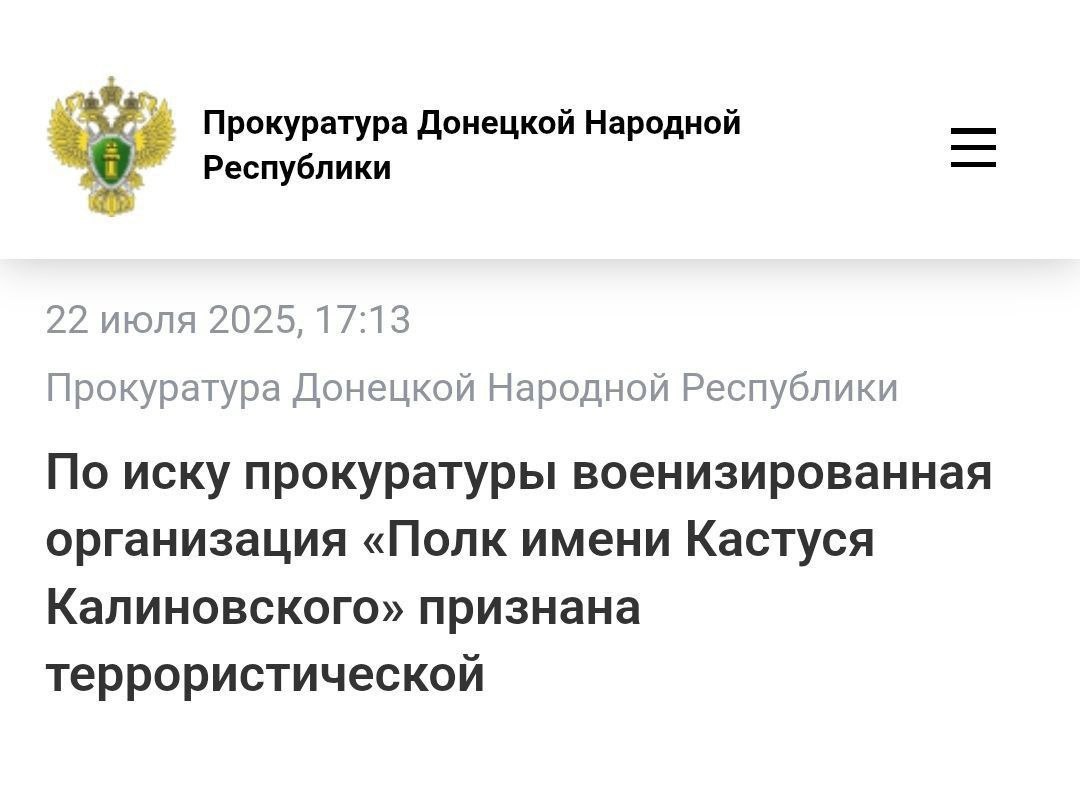 #наемники Суд в ДНР признал террористическим украинский "Полк имени Кастуся Калиновского"*, сформированный из белорусских радикалов, сообщила прокуратура республики. В сентябре прошлого года "Полк Калиновского"* был признан террористическим в Беларусии. * признан террористической организацией и запрещён в России https://t.me/geochronic | https://geochronic.ru