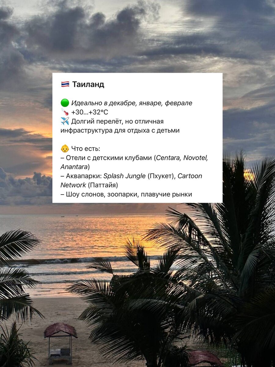 ❄️ Зимний отдых с ребёнком: куда поехать из России? Ищете, куда улететь с детьми в декабре–феврале? Вот лучшие направления, где можно выбрать между солнцем и морем или зимней сказкой в горах. ☀️ Тёплые пляжные направления 🇹🇭 Таиланд ⏺ Идеально в декабре, январе, феврале 🌡 +30…+32°C ✈️ Долгий перелёт, но отличная инфраструктура для отдыха с детьми 👶 Что есть: – Отели с детскими клубами (Centara, Novotel, Anantara) – Аквапарки: Splash Jungle (Пхукет), Cartoon Network (Паттайя) – Шоу слонов, зоопарки, плавучие рынки 🇻🇳 Вьетнам ⏺ Сухой сезон с ноября 🌡 +28…+30°C ✈️ Долгий перелёт, инфраструктура попроще, чем в Тае 👶 Что есть: – Детские клубы в Vinpearl, JW Marriott – Аквапарки: VinWonders (Нячанг), Corona (Фукуок) – Пляжи с белым песком, экскурсии: Халонг, Sun World (Дананг) 🇦🇪 ОАЭ ⏺ Отлично в январе–феврале 🌡 +25…+28°C (море прохладное, но комфортно) ✈️ Удобный перелёт (5 часов) 👶 Что есть: – Aquaventure, Yas Waterworld, Ferrari World – LEGOLAND, Dubai Aquarium – Мн