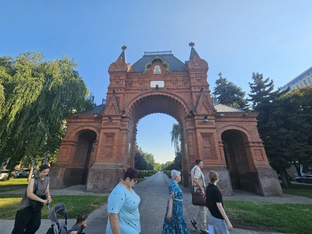 Арка была возведена по проекту архитектора В.А. Филиппова к визиту императора Александра III и его семьи в Екатеринодар. Она символизировала гостеприимство и уважение к императору со стороны горожан и купечества. Памятник выполнен в древнемосковском стиле, характерном для конца XVI века. Арка имела три пролета, украшенных шпилями с двуглавыми орлами, шатровую крышу и декоративные решетки. В 1928 году арка была разрушена, а в 2009-м восстановлена на новом месте — на пересечении улиц Красной и Бабушкина. Памятник св. Екатерине и Триумфальная арка, стоящая рядом, образуют единый архитектурный ансамбль. Последним пунктом нашей короткой экскурсии стал новый старый стадион.