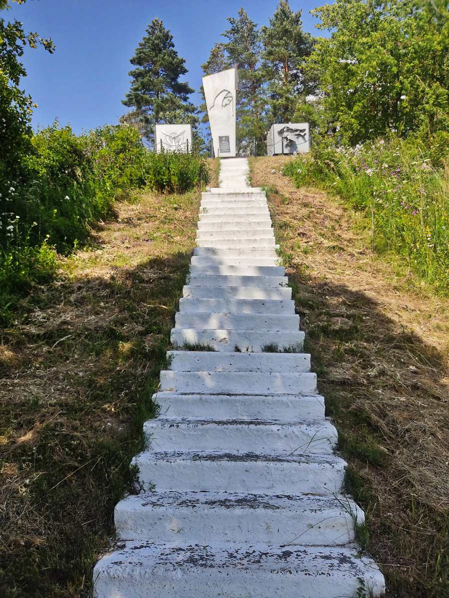 #556. Калужская область. Юхновский район. Неподалёку от деревни Колыхманово, на восточном берегу реки Угры находится монумент павшим в 1941 году в битве за Москву. Здесь находятся памятники - лётчику А.Г. Рогову, совершившему огненный таран по скоплению немецкой техники у переправы. - начальнику парашютно-десантной службы Западного фронта, одному из руководителей обороны на юхновском направлении в начале октября 1941 года, майору И.Г.Старчаку. Подвиг десантников. Планировалось, что в ночь на 4 января 1942 парашютисты отряда майора Старчака в составе 416 человек захватят аэродром в районе села Большое Фатьяново (в 5 км восточнее Мятлево, на западном берегу реки Шани), куда затем на самолётах будет доставлен 250-й воздушно-десантный полк (1300 человек) прибывшей из Забайкалья 82-й стрелковой дивизии. Они должны были перерезать шоссе Юхнов-Медынь, чтобы пресечь движение противника из района Калуги на Вязьму, а также захватить станцию Мятлево и полностью парализовать немецкие тылы в