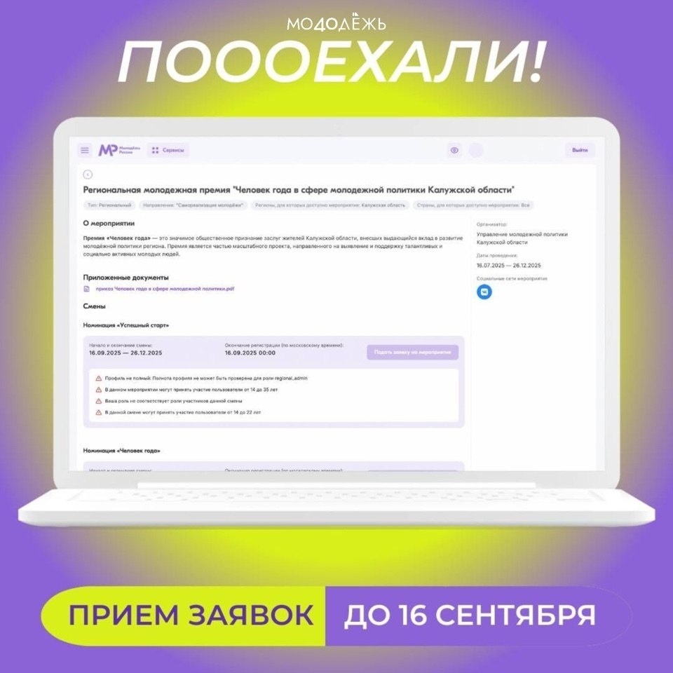 Региональная премия для молодых и активных! Стартовала регистрация на участие в региональной премии «Человек года в сфере молодёжной политики Калужской области». Главная цель премии – общественное признание и поддержка на региональном уровне выдающихся заслуг молодёжи Калужской области, выявление и поощрение лучших представителей молодёжного сообщества. Выбирай подходящую для себя номинацию: «Амбассадор #молодёжь40», «Событие года», «Доброволец года», «Сообщество молодых», «Наставник молодых», «Успешный старт» и «Человек года». Подробная информация о премии и регистрация по ссылке: https://clck.ru/3NFbj6 Успей подать заявку до 16 сентября! Награждение победителей и участников пройдёт на итоговом мероприятии в декабре.