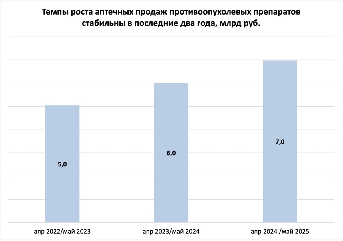 Ежегодно россияне тратят 7 млрд руб. на покупку препаратов от рака. Эта цифра растет на 1 млрд руб. в год. За 12 месяцев с апреля 2024-го по май 2025 года аптечные продажи противоопухолевых препаратов выросли на 6% в упаковках и на 16% в рублях.