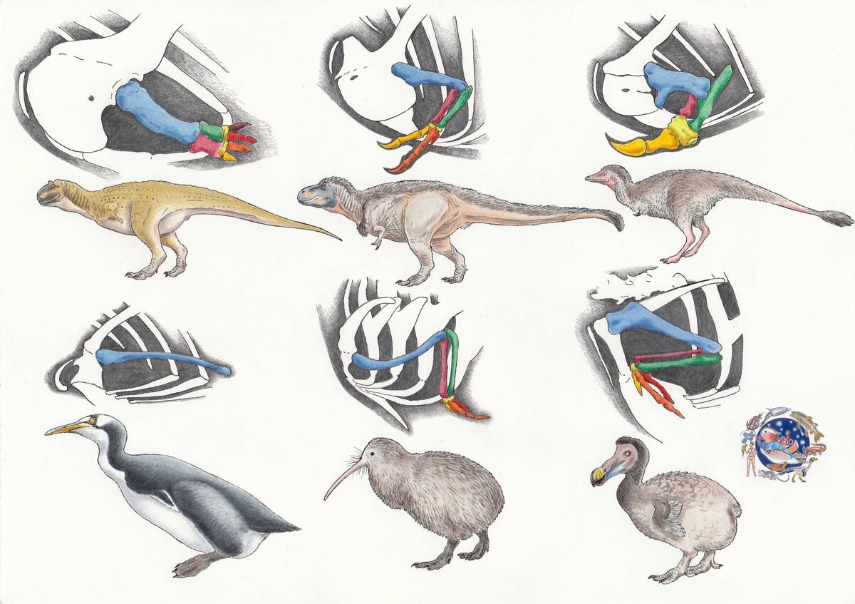 На рисунке показаны различные случаи быстрой редукции передних конечностей у шести групп мезозойских и кайнозойских динозавров-теропод – представители семейств слева направо и сверху вниз: абелизаврид (Abelisauridae), тираннозаврид (Tyrannosauridae), альваресзаврид (Alvarezsauridae), гесперорнитид (Hesperornithidae), аптеригид (Apterygidae) и рафид (Raphidae).