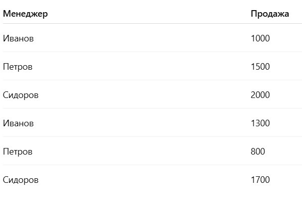 - Затем просуммировать все строки, где менеджер совпадает с этим именем.