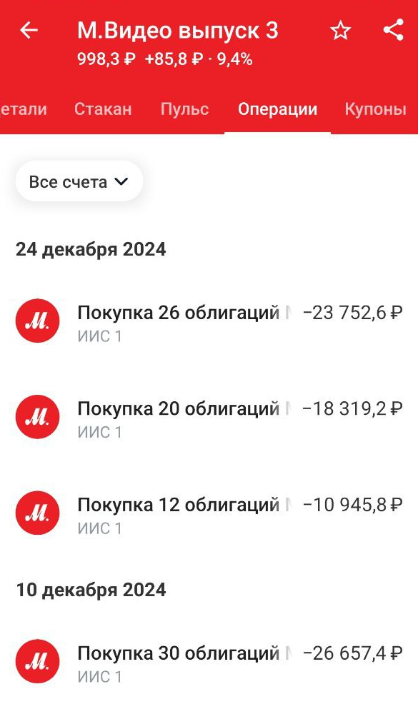 На днях у меня, да и у мужа на ИИС погасились облигации М.Видео выпуск 3 и я в очередной раз решила, что все-таки иногда полезно рисковать. Но не всегда! Для начала покажу немного цифр! Основная проблема данной компании заключается в том, что она убыточная. То есть М.Видео - это топка, куда надо подбрасывать деньги. Инвесторов этот факт немного смущает, они опасаются, что топливо закончится. Хотя я повторю то, что говорила много раз. Вот есть основной акционер, пускай его бизнес несет убытки, но ему не выгодно допускать дефолт и оставаться ни с чем. Ему намного выгоднее провести дополнительную миссию акций, чтобы спасти бизнес, пускай в ущерб своей доли в нем. Когда я начала покупать данный выпуск 6 декабря 2024 года, он стоил по 880,34 рубля. Потом он правда подрос до 888 рублей, а затем еще больше. Всего я набрала 101 штуку на два счета. Когда я начала покупать, до погашения оставалось 229 дней. Я покупала ниже номинала, поэтому дельта в 1000-881=119 рублей принесла 119/881=13,5% ил