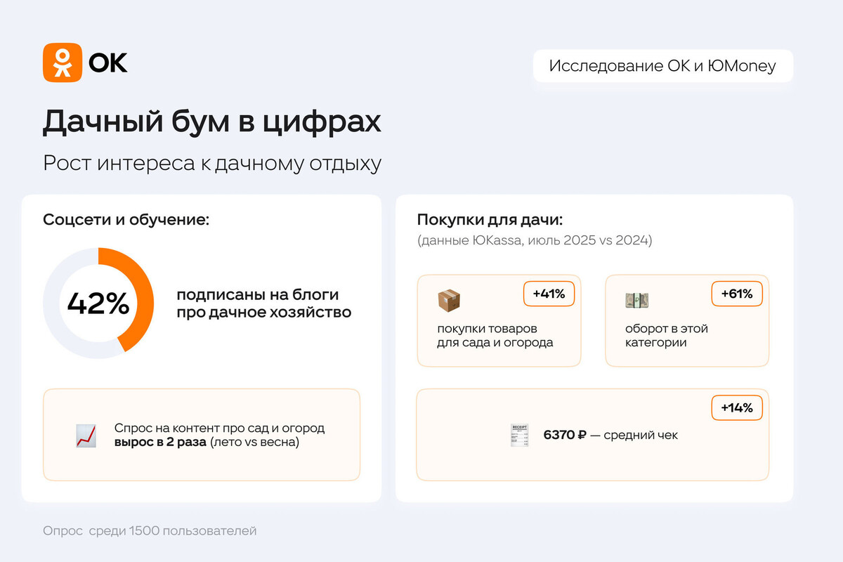 Ко Дню дачника, который отмечается 23 июля, социальная сеть «Одноклассники» и финтех-компания ЮMoney провели опрос среди 1500 пользователей. У респондентов узнали, как они предпочитают проводить время на даче. Согласно опросу, каждый третий житель страны посещает загородный участок летом, а каждый четвертый проводит там выходные. Выяснилось, что 16% опрошенных и вовсе живут на даче в этот сезон. Исследования показали, что 54 процента россиян выбирают отдых на свежем воздухе. Около 40 процентов опрошенных занимаются дачными делами – ухаживают за грядками и теплицей. 31 процент дачников выбирают искупаться в реке или бассейне, 29 процентов предпочитают попариться в бане, а еще 21 процент респондентов увлекаются садом и ландшафтным дизайном. Спортивно проводят время на даче только 9 процентов жителей страны. Выращивание урожая для многих остается важной частью дачной жизни. Совсем не занимаются огородом лишь 16 процентов респондентов. Для 40 процентов опрошенных дача – это место полноценн