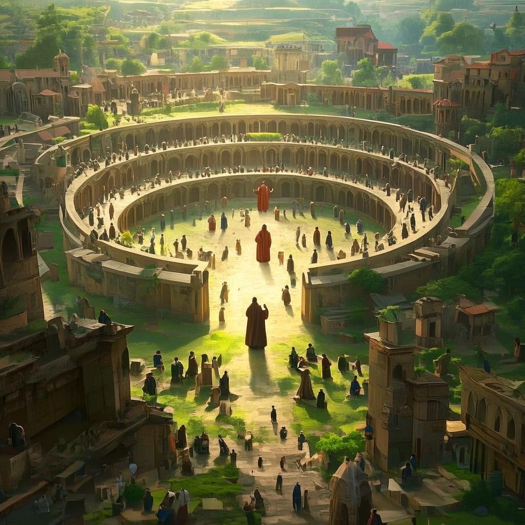 - 🌍 Город построен как идеальная геометрическая модель — семь концентрических стен, на каждой — нарисованы законы природы, астрономия, науки.