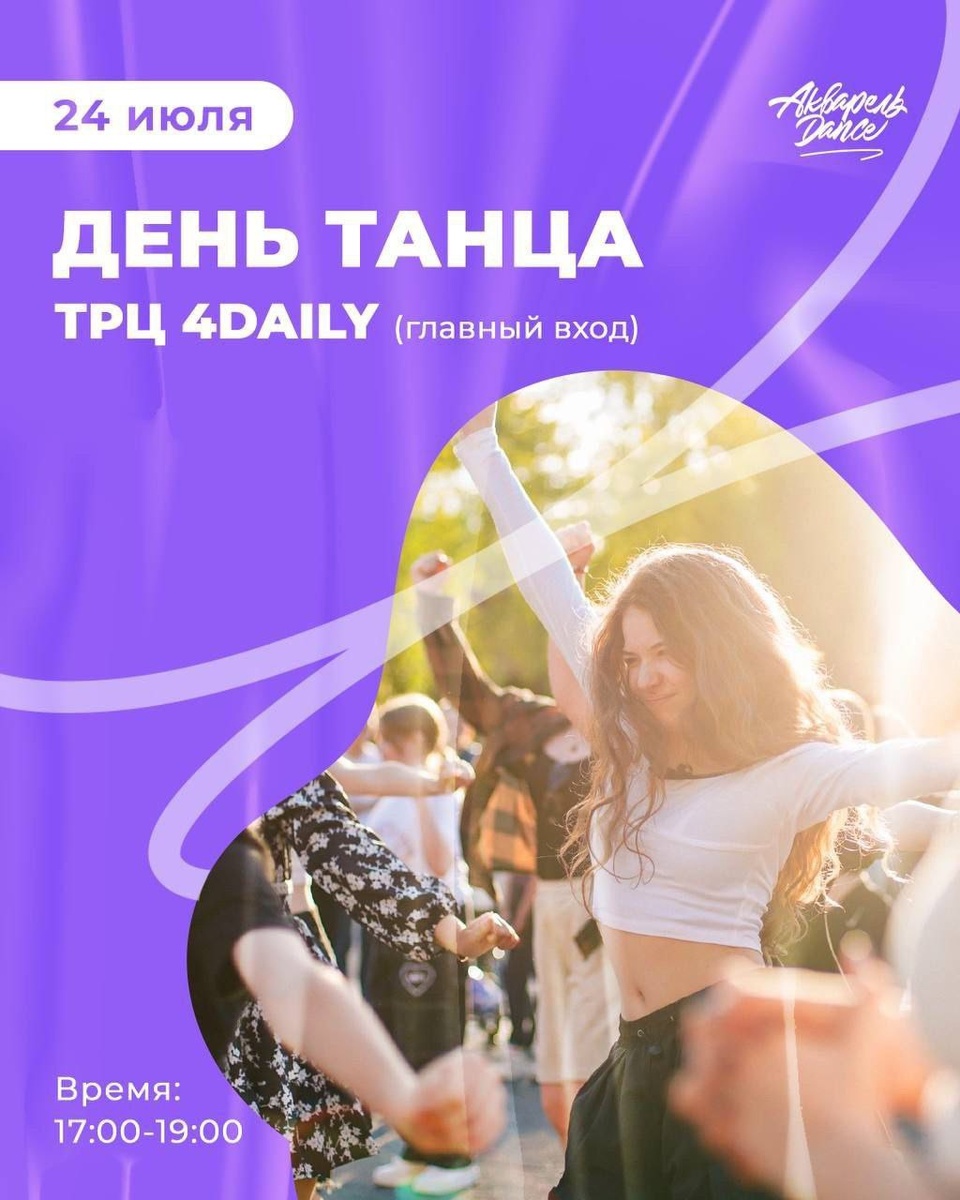 САМЫЙ ЖАРКИЙ ТАНЦЕВАЛЬНЫЙ ДЕНЬ УЖЕ СКОРО… …готовьтесь к Дню танцев 24 июля у ТРЦ «4Daily» (главный вход) ⠀ Программа: 👉 17:00 — Старт, приглашение гостей и знакомство 👉 17:10 — Мастер-класс по HIP-HOP с Сергеем Никитиным 👉 17:30 — Творческий мастер-класс — прокачай фантазию и вдохновение 👉 18:00 — Танцевальный мастер-класс по STREET MIX от Абдиханова Мурата 👉 18:20 — Танцевальный флешмоб + викторина 👉 18:40 — Мастер-класс по DANCE MIX от Власенко Александра 👉 19:00 — Розыгрыш призов от школы танцев «Акварель Dance» Кроме того: 🤍 Бесплатная сладкая вата для участников мастер-классов и розыгрыша 🤍 Аниматор — для ещё большей атмосферы праздника Не пропусти — 24 июля будет жарко и суперинтересно🔥 📍 Мытищи, ТРЦ 4Daily