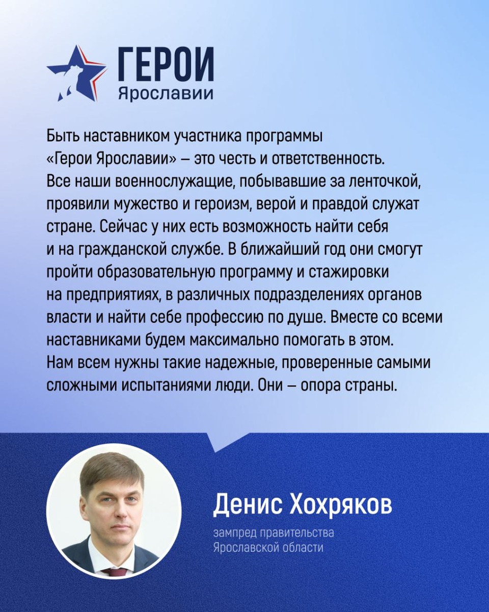 Участники программы «Герои Ярославии» встретились со своими наставниками Бойцы СВО начали работать с кураторами. Вместе они определят, как развиваться дальше — в профессии и в жизни. Наставники помогут советом, поделятся опытом, поддержат во время учебы и стажировок. На первый поток подали около 300 заявок, в финал вышли 34 человека. Почти у всех есть высшее образование, некоторые окончили несколько вузов. Среди них — кавалеры ордена Мужества, награжденные медалями Жукова, Суворова, «За отвагу». Во время учебы запланированы стажировки в правительстве, муниципалитетах и на заводах. А уже после нее участники займут руководящие должности в органах власти, учреждениях и на предприятиях области.