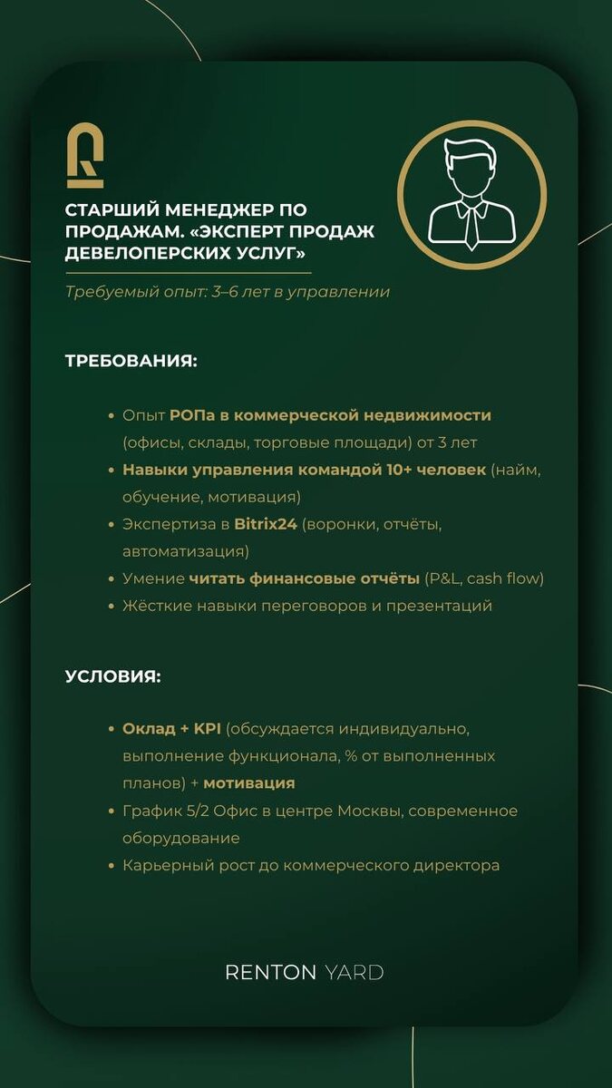 🔴#вакансия — RENTON YARD DEVELOPMENT 🔴 Мы расширяем команду. Ищем ответственного и вовлечённого специалиста, который разделяет наш подход: системность и ориентацию на результат. 📎Опыт работы в смежных сферах приветствуется: девелопмент, архитектура, инвестиции, управление проектами. ✉️Для отклика: @rentonyardd