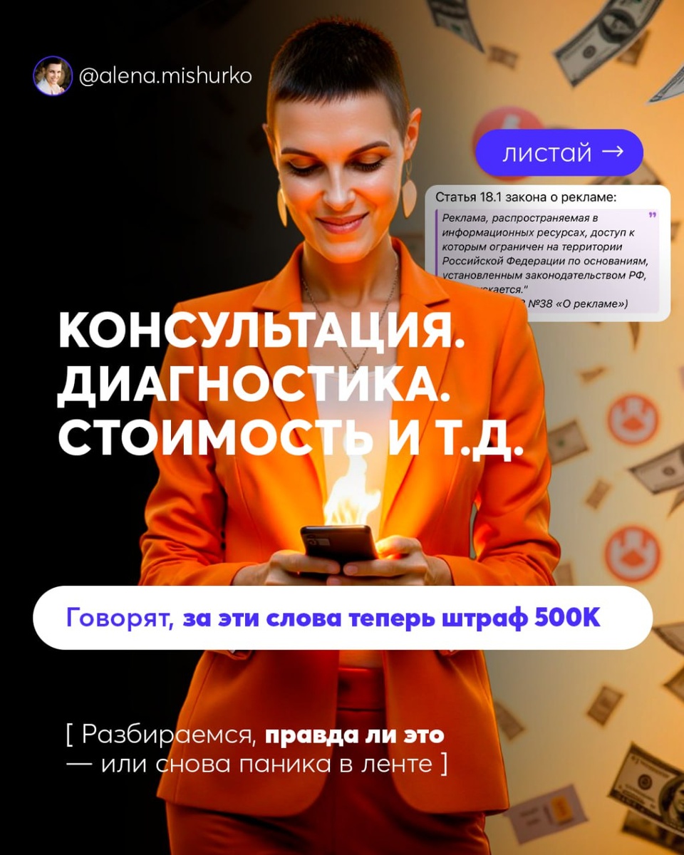 Консультация. Диагностика. Стоимость и т.д. Говорят, за эти слова теперь штраф 500 000₽ — разбираемся, правда ли это или паника в ленте? Многие слышали о страшных списках якобы «запрещённых фраз» для Instagram после 1 сентября — «консультация», «диагностика», «курс»… Что из этого правда, а что – паника? Разбираем прямо сейчас. С 1 сентября новый закон о рекламе 2025 вводит штрафы за рекламу на запрещённых площадках — Instagram, Facebook и прочих соцсетях, признанных экстремистскими. Причём штрафовать могут даже за старые посты — опубликованные задолго до даты. Один и тот же термин может быть безопасным, если он проинформирован, и нарушительным — если есть призыв или коммерческая цель . Примеры: ❌ Нельзя: «Записывайтесь на консультацию, осталось 2 места!» «Успей на марафон, бонусы только до завтра!» ✅ Можно: «Разбираем кейс с клиенткой — какие были ошибки» «5 типичных проблем на консультациях, которые мешают результату» _____________________________________ Я много пишу о том, как