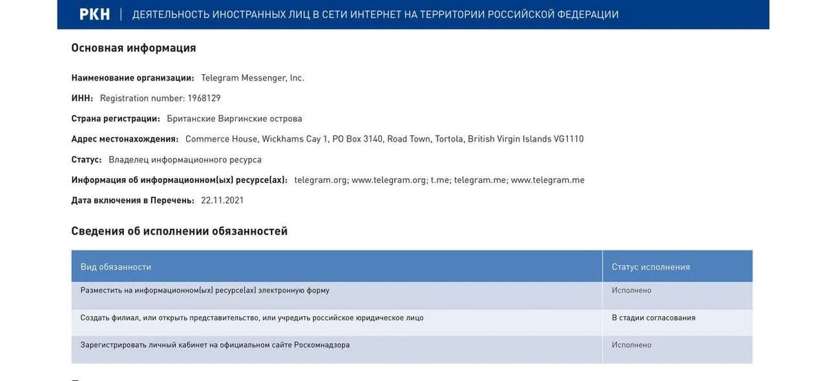 Telegram начал регистрацию представительства в России, следует из реестра РКН. Мессенджер намерен выполнить требования закона «о приземлении» и создать филиал, пишут СМИ.