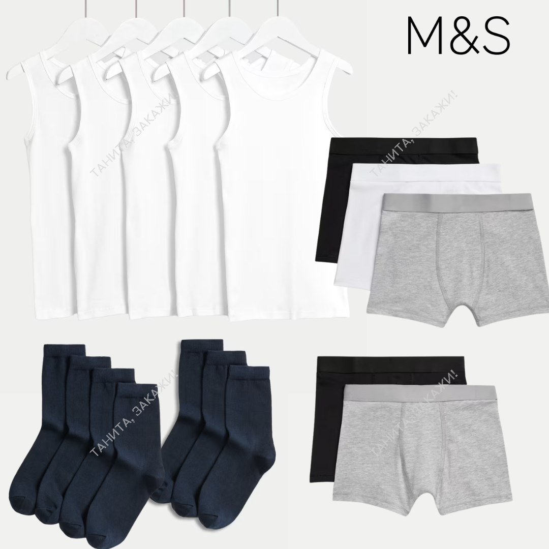 Marks & Spencer Майки, набор из 5шт для мальчиков 1600₽ + доставка 2-14Y 100% хлопок Трусы, набор из 5шт для мальчиков 1700₽ + доставка 5-8Y, 15-16Y 95% хлопок Носки, 7 пар для мальчиков 1200₽ + доставка 73% хлопка 📩 @tanita_sadovnik 🚚 Доставка 4-6 недель 📦 ✅ 100% оригинал 🇺🇸