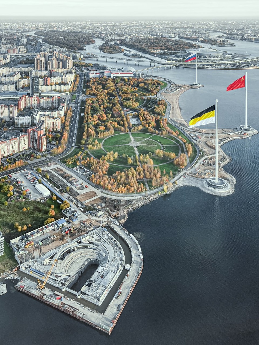 Вид на парк 300-летия Санкт-Петербурга и 179-метровые флагштоки со стороны смотровой площадки небоскрёба «Лахта Центр