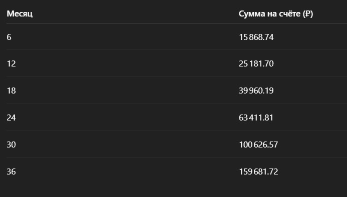 Он работает автоматически, торгует каждый день, и при разумной стратегии может давать от 5 до 10% в месяц. Если вы не снимаете прибыль, а оставляете её на счёте, то запускаете тот самый механизм сложного процента. Через 3 года с вложением всего 10 000 рублей и без пополнений, ваш капитал может вырасти до почти 160 тысяч рублей благодаря силе сложного процента. Это и есть сила долгосрочного мышления: сегодня немного — завтра в разы больше. Потому что: А тот, кто умеет ждать и применять стратегию реинвестирова