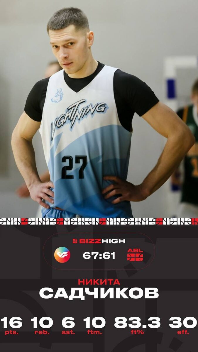 Лучшие перфомансы недели Bizz High Садчиков Никита (МКБ) vs ABL CREW 16 очков, 10 подборов, 6 передач, 10/12 штрафные, 30 эффективность Садчиков удачно дебютировал за МКБ и помог команде добыть победу в овертайме против обновленного состава ABL Crew. Никита не стал брать на себя роль снайпера, отдав 6 передач уже за первые две четверти. А во второй половине матча включился по полной программе, забивая, подбирая и играя в защите. Как итог лучшая эффективность в туре. Bizz Love Калакин Ярослав (СПАО «ИНГОССТРАХ») vs КРОК 35 очков, 3 подбора, 4 перехвата, 34 эффективность Калакин вышел со скамейки в середине первой четверти и набрал 13 очков за 6 минут. Ярослав продолжил терзать защиту КРОКА после перерыва, забивая броски с любым сопротивлением с диким процентом. По итогу встречи Калакин реализовал 16 из 22 бросков с игры — фантастические цифры для игрока задней линии. Rest WBL Никитина Елена (Charlotte Sting) vs Matrix 27 очков, 10 подборов, 8 перехватов, 29 эффективность Sting оче