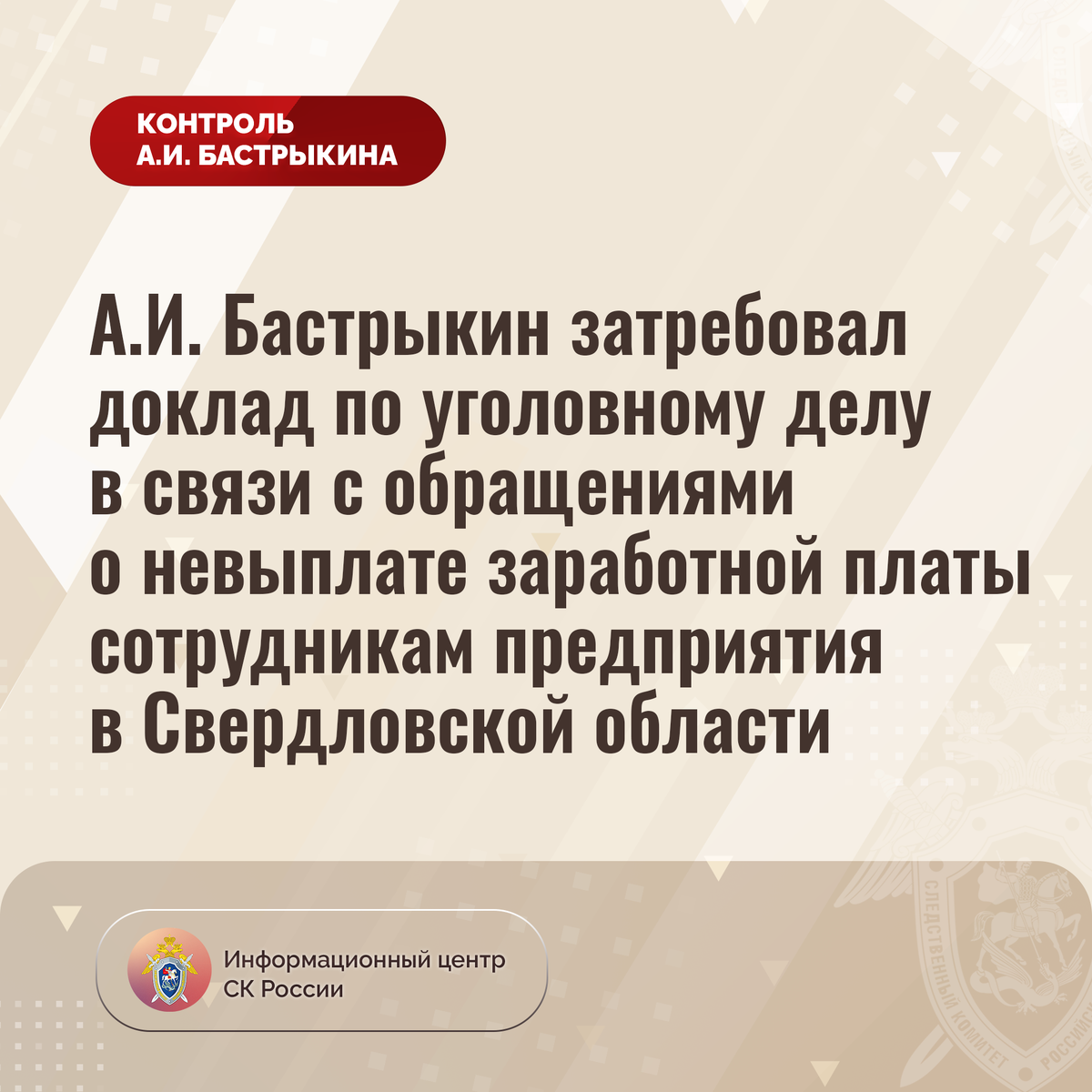 А.И. Бастрыкин затребовал доклад по уголовному делу в связи с обращениями о невыплате заработной платы сотрудникам предприятия