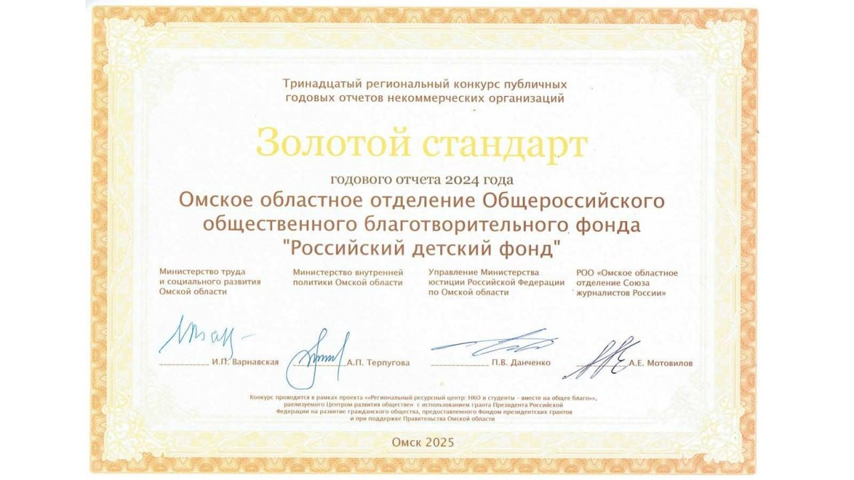 🇷🇺 Омичи – за открытость деятельности НКО Омское областное отделение Российского детского фонда ежегодно проводит публичные отчёты перед населением в Региональном центре по связям с общественностью и на других городских площадках, а также публикует текстовые отчёты на официальном сайте организации и на Портале НКО Омской области. В копилке отделения уже 10 золотых и серебряных сертификатов регионального конкурса годовых публичных отчётов НКО, который проводит Центр развития общественных инициатив при поддержке Фонда президентских грантов. В жюри конкурса – Министерство внутренней политики Омской области, Министерство труда и социального развития Омской области, Управление Министерства юстиции Российской Федерации по Омской области и Омское областное отделение Союза журналистов России. На подведении итогов 13 регионального конкурса годовых публичных отчётов НКО сертификат «высшей пробы» председатель Омского регионального отделения РДФ Ольга Мосеева получила из рук начальника Управ