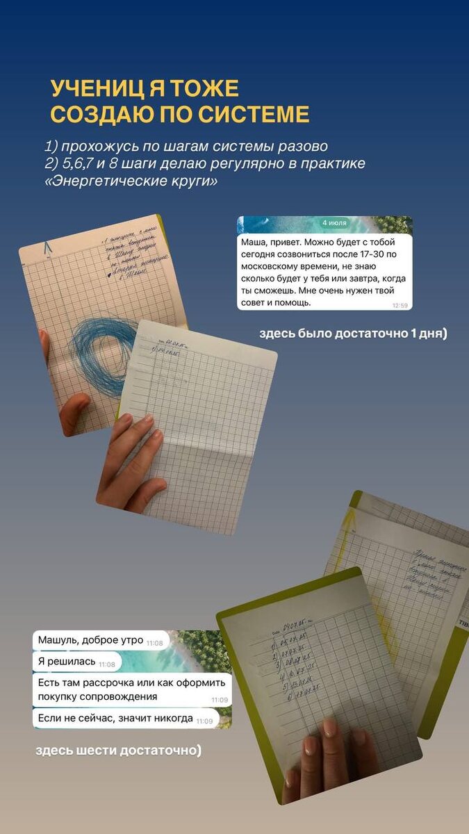 8️⃣даже учениц я создаю через систему. И я счастлива, что больше не нужно упахиваться в маркетинговых схемах, как же я выгорала от них сильно( кому знакомо?