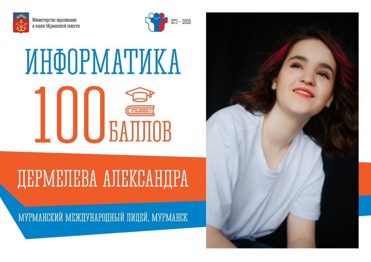 Выпускница Мурманского международного лицея Александра Дермелева уверена, что высокий результат на ЕГЭ по информатике – плод не только собственных усилий, но и итог работы и терпения учителя Елены Смирновой. «Я всегда буду помнить не только ее уроки, но и поддержку, чуткость и профессионализм, которые помогли мне найти своё призвание. Елена Алексеевна научила не только лучше программировать и разбираться в алгоритмах, но и мыслить нестандартно, искать решение самых сложных задач и верить в свои силы», – считает девушка. Александра – призер муниципального этапа Всероссийской олимпиады школьников по математике и информатике в 11 классе, регионального этапа по английскому языку – в 10 и 11 классах. Принимала участие в образовательных программах в «Сириусе», «Сириус Лицее» и школе «Летово». Увлечения девушки – программирование и музыка, а мечтает она стать программистом и обучаться в НИУ ИТМО.