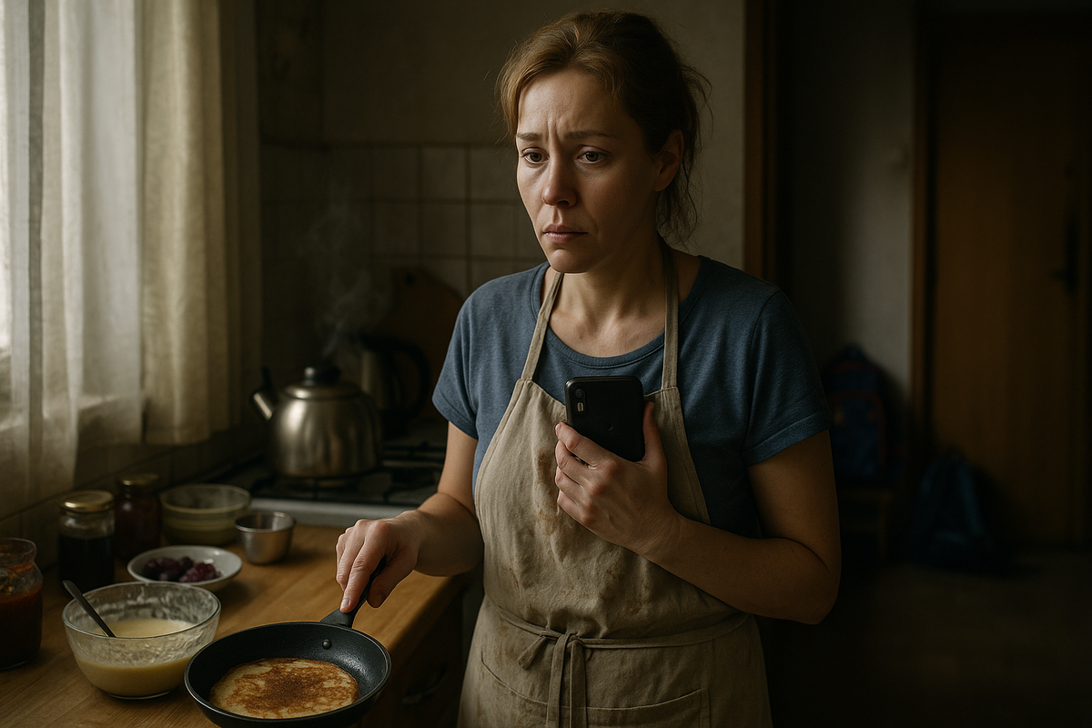 На кухне пахло блинчиками и ванильным кремом. Светлана одновременно помешивала начинку для торта и переворачивала румяные блинчики — дети обожали их с вареньем. Телефон зазвонил в самый неподходящий момент. Руки в тесте, сковородка шипит — она машинально нажала на зеленую кнопку.