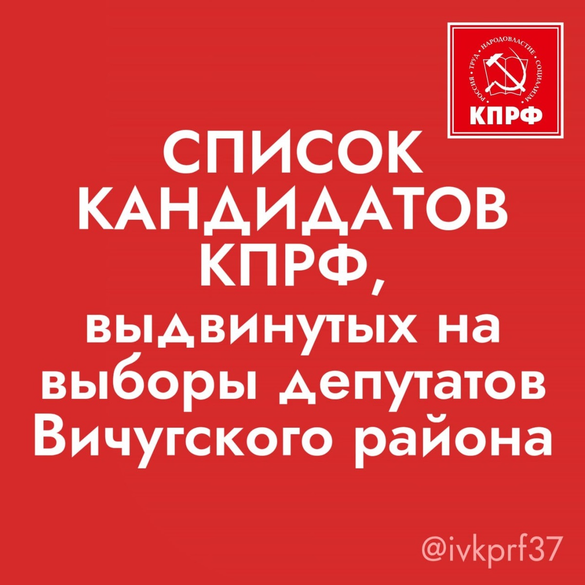 В Совет Вичугского муниципального района первого созыва от Ивановского областного отделения КПРФ выдвинуты: ✅Хренов Павел Александрович 04.08.1965 года рождения, дежурный администратор ООО «МАКСИ», депутат Совета Каменского городского поселения Вичугского муниципального района Ивановской области, член КПРФ. Округ №1. ✅Брундаев Сергей Александрович 03.01.1959 года рождения, пенсионер, член КПРФ, Первый секретарь Комитета Вичугского районного отделения КПРФ. Округ №2. ✅Клинг Елена Юрьевна 26.08.1966 года рождения, пенсионер, депутат Совета Новописцовского городского поселения четвертого созыва Вичугского муниципального района Ивановской области, член КПРФ, секретарь Комитета по идеологической работе Вичугского районного отделения КПРФ. Округ №2. ✅Курицын Лев Петрович 07.10.1952 года рождения, пенсионер, член КПРФ, член КПРФ, Округ №3.