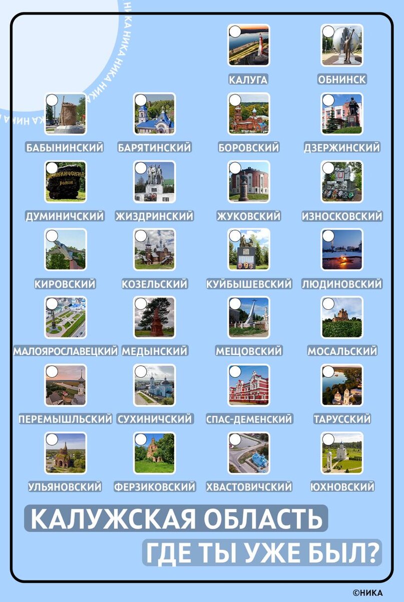 😮 У кого больше галочек получится? В Калужской области 2 городских округа и 24 района — это десятки тысяч квадратных километров потрясающих пейзажей, заповедных уголков и оригинальной архитектуры. Предлагаем интересный способ поделиться воспоминаниями о своих поездках по области — карточка путешественника! ✔️Скачивайте или делайте скрин карточки, отмечайте галочкой, где уже побывали и скидывайте в комментарии. Посмотрим, кто у кого будет больше отметок и какие районы в Калужской области самые популярные. 👀 Делитесь с друзьями 🤖 Прислать новость 📺 Заказать рекламу