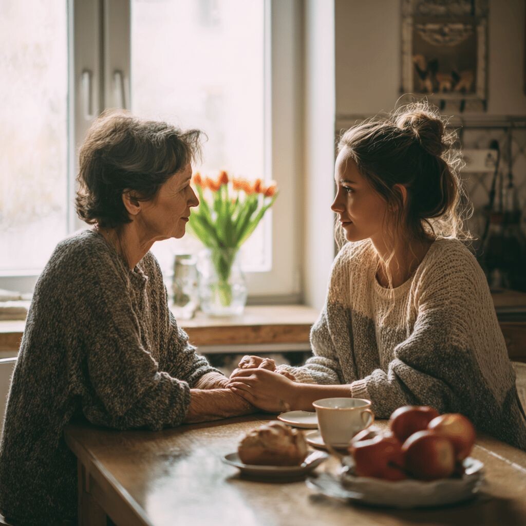 Особых разговоров у нас не было — сначала… Я училась быть рядом, не лезть с советами, не навязывать разговоры о нём. Просто молча ставила чашку чая поближе, тёплую грелку к ногам, и раз в день — по-настоящему смотрела на неё. Иногда хватало одного взгляда, чтобы всё понять без слов.