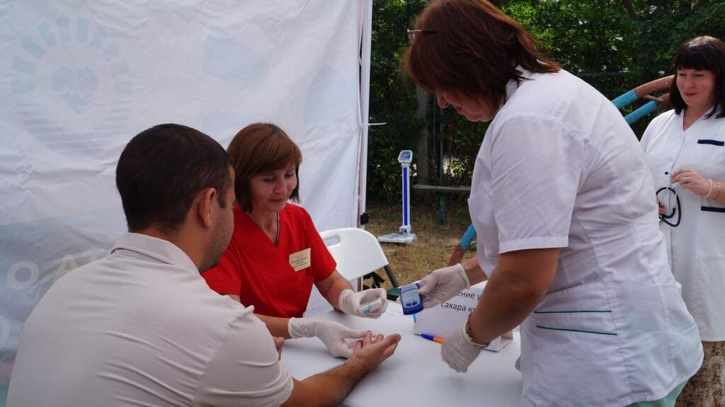 23 июля в Донецке продолжил работу новый проект по организации доступной медицинской помощи населению. Временный «Пункт здоровья» сегодня смогли посетить жители поселка Шевырев, а также — все желающие. Дончане смогли совершенно бесплатно пройти комплексное экспресс-обследование, включающее измерение артериального давления, определение роста и веса с расчетом индекса массы тела, анализ уровня глюкозы и холестерина в крови, измерение насыщения крови кислородом, проверку мышечной силы и проведение электрокардиографии. После этого горожане получили консультации медицинских специалистов, которые отвечали на вопросы пациентов. — Сегодня привезла сюда бабушку и решила сама пройти обследование. Очень удобно, что все можно сделать быстро и бесплатно, — поделилась своими впечатлениями директор клуба ЦОФ Светлана Грахольская. — Мы с людьми работаем, а это значит, что нужно как можно больше знать о своем здоровье, поэтому такое событие пропустить не могли. — Сегодня вместе с другими дончанами прин