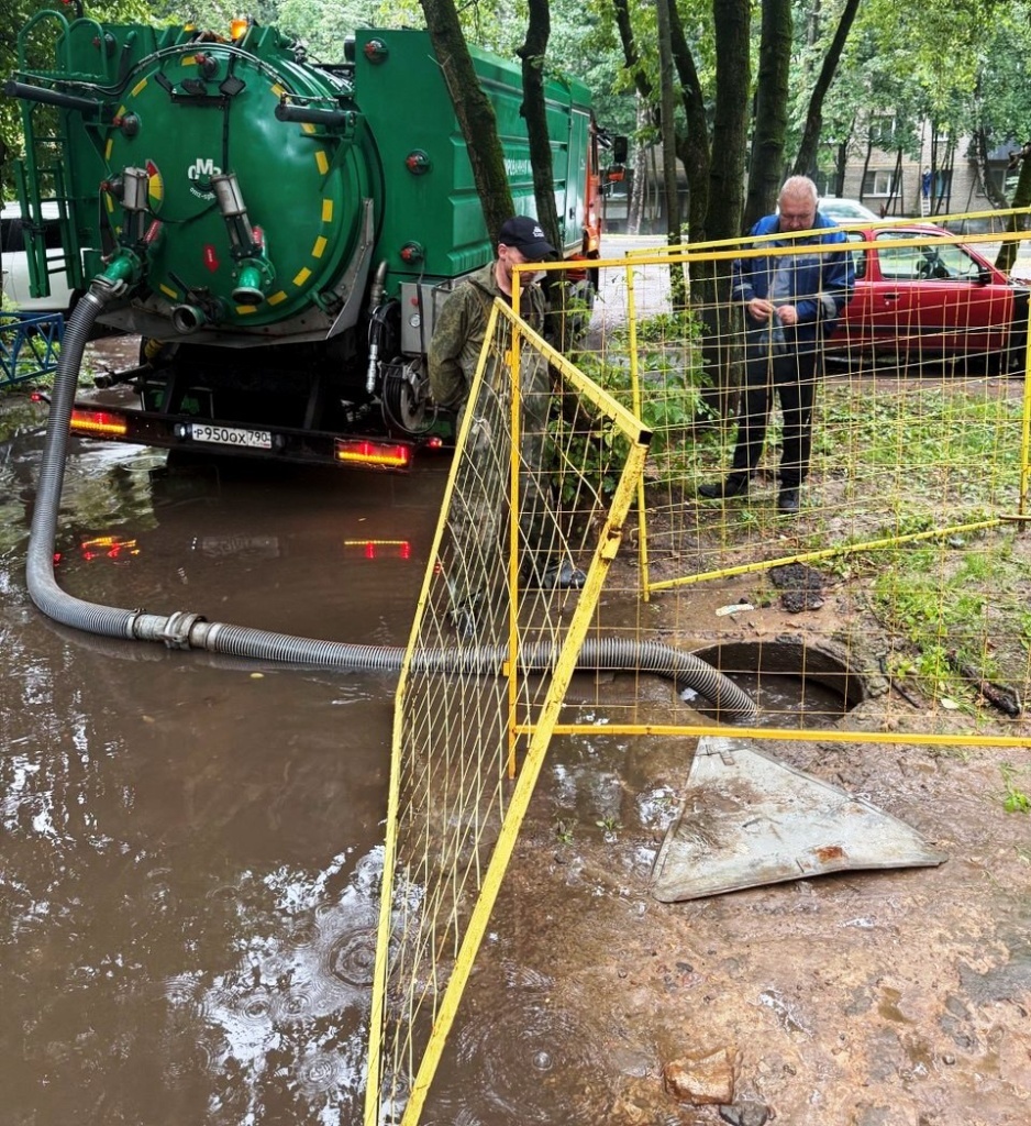 Работы включали откачку скопившейся воды и очистку ливневых канализационных систем. На городских магистралях, в частности в микрорайоне Заветы Ильича и Ивантеевке, применялись мощные илососные машины, а для осушения дворовых территорий задействовались компактные насосные установки. После откачки проводилась обязательная прочистка дренажных каналов для предупреждения повторных затоплений. Фото: Пресс-служба Администрации г.о. Пушкинский