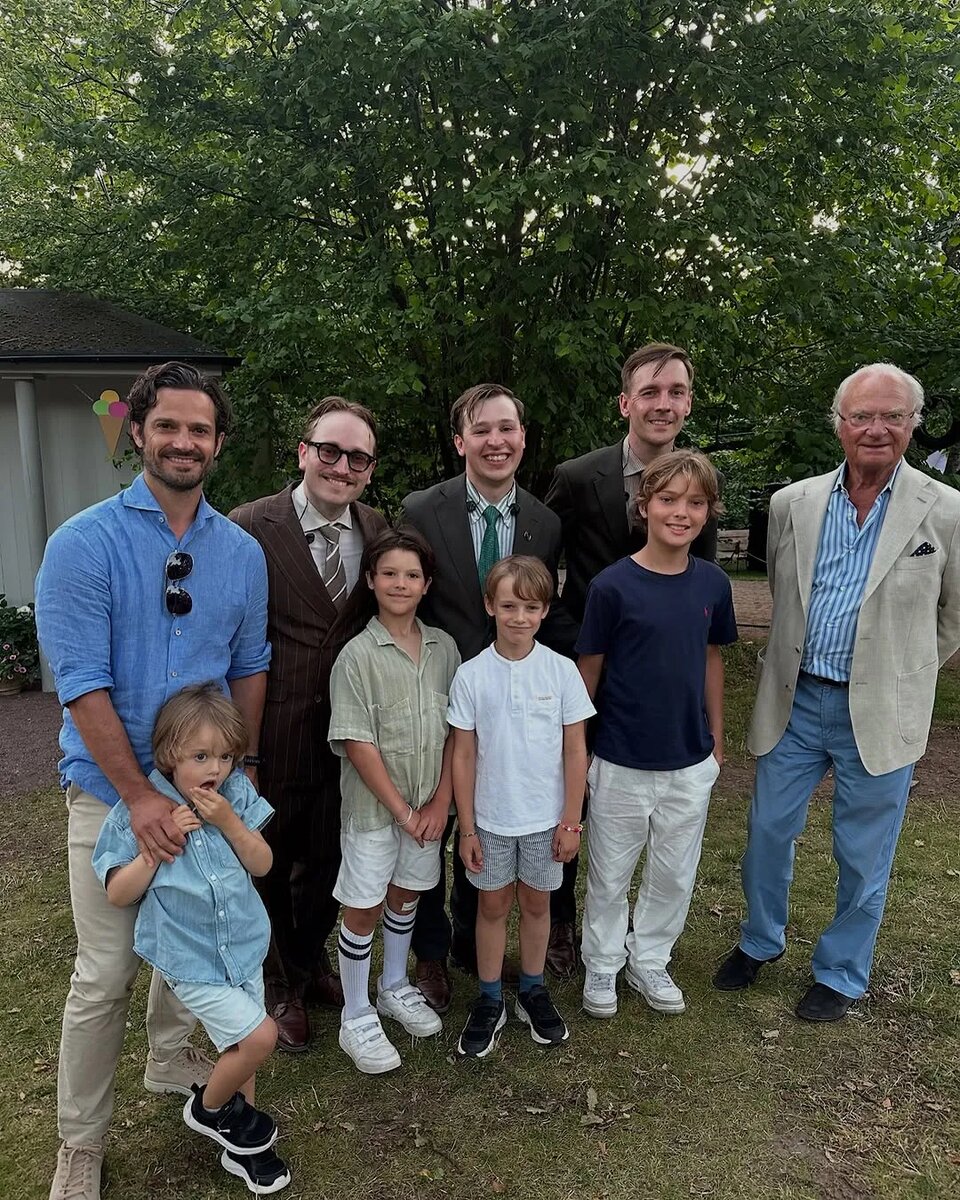 На милой фотографии, опубликованной группой в Instagram, король и принц улыбаются, стоя рядом с финско-шведским музыкальным и комедийным трио. Карл Филип оделся повседневно: на нём синяя льняная рубашка и брюки чинос, а его отец надел более нарядный костюм: полосатую рубашку и бежевый блейзер. Трое сыновей Карла Филиппа — девятилетний принц Александр, семилетний принц Габриэль и четырёхлетний принц Джулиан — присоединились к веселью, как и сын его сестры, принцессы Мадлен, 10-летний принц Николас.