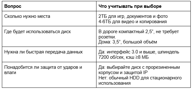 Кажется, чем больше объём памяти жёсткого диска, тем лучше. Но по факту его недостаточно. Например: начали монтировать съёмку, но каждый файл записывается по нескольку минут. Взяли диск с собой в дорогу, бросили в чемодан, а потом выясняется, что он перестал работать. Чтобы такого не случилось, важно учитывать другие характеристики. Рассказываем, на что смотреть при покупке внешнего HDD. От неё зависит количество файлов, которые поместятся на внешний накопитель. Для документов, таблиц и презентаций. Подойдёт диск от 500 ГБ. На него влезет примерно 200-300 тысяч офисных файлов – Word, Excel, PDF и презентации. Такой объём берут для учёбы, работы с отчётами или бэкапа текстовых заданий. Для фото, видео и игр. Достаточно 1-2 ТБ. В такой объём войдёт от 250 тысяч фотографий, от 500 часов видео в формате НD и десятки игр. Для объёмных файлов. Количество файлов, которые поместятся в 4-6 ТБ, зависят от размера и типа файла. Ориентировочно можно разместить от 1-2 проектов до десятка небольших.