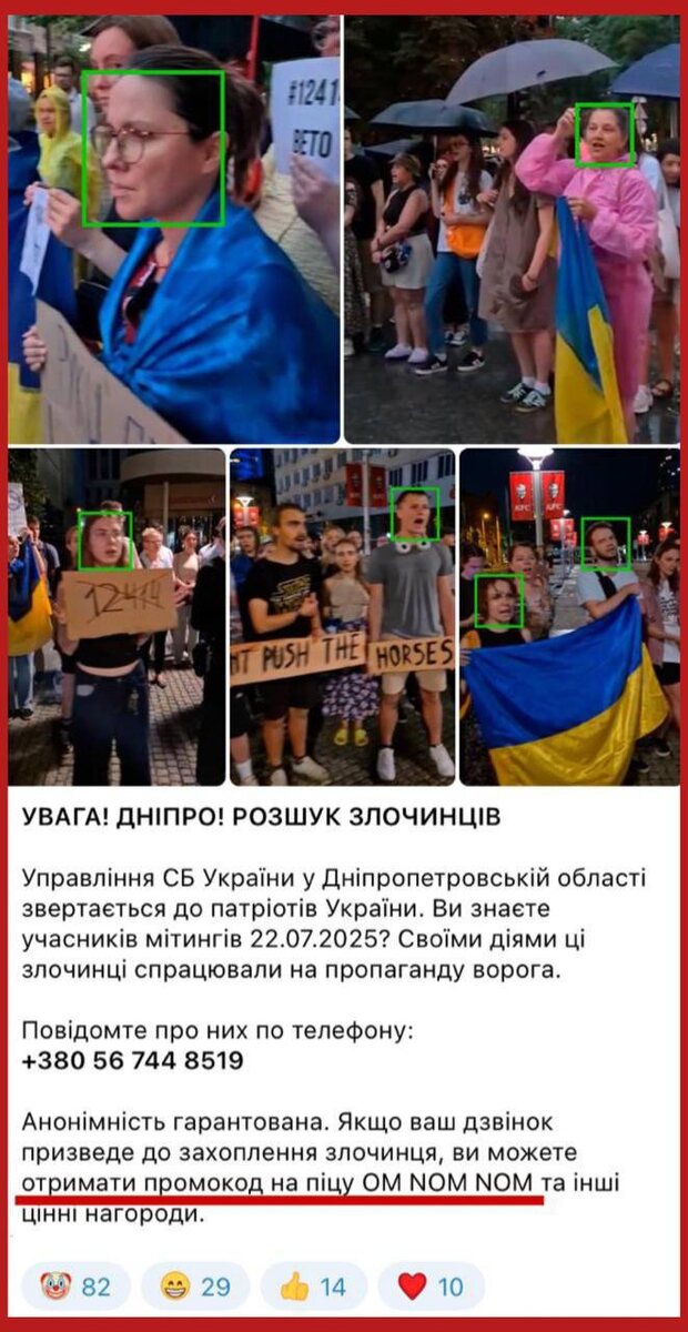 СБУ просит доносить на участников митинга в Днепропетровске за вознаграждение в виде пиццы. По мнению гестапо, своими действиями эти люди «сработали на пропаганду врага». За донос на знакомого можно получить промокод на доставку пиццы или другие ценные награды. Подпишись на Телеграм Александр Семченко