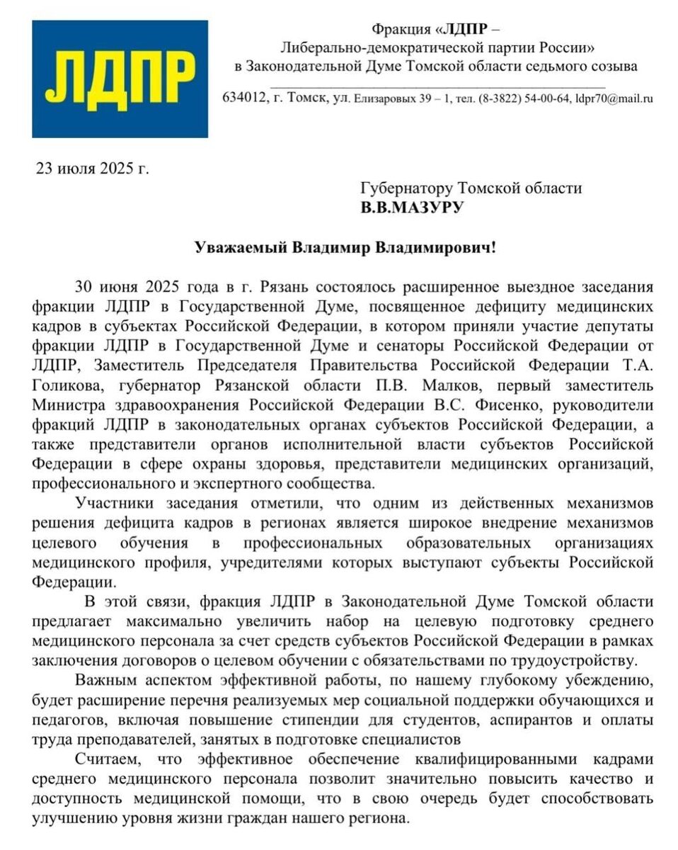 ЛДПР предлагает увеличить целевой набор медработников в Томской области Депутаты фракции ЛДПР направили обращение губернатору Томской области Владимиру Владимировичу Мазуру с инициативой усилить подготовку среднего медицинского персонала. Острая нехватка фельдшеров и медсестер требует системных решений, и ЛДПР предлагает конкретные шаги: ✅ Целевой набор один к одному Обучать ровно столько специалистов, сколько не хватает в регионе. Это полностью в полномочиях области – обеспечить медицинские учреждения кадрами, а молодежь – гарантированным трудоустройством и стабильностью. ✅ Медклассы и ранняя профориентация Создать медицинские классы в школах, особенно в сельских районах. Местные жители, получив образование, чаще возвращаются работать на малую родину, в отличие от выпускников из крупных городов. ✅ Развитие наставничества Закрепление опытных специалистов за молодыми кадрами поможет быстрее адаптировать их в профессии и снизить текучесть. Инициатива направлена на рассмотрение. Подд