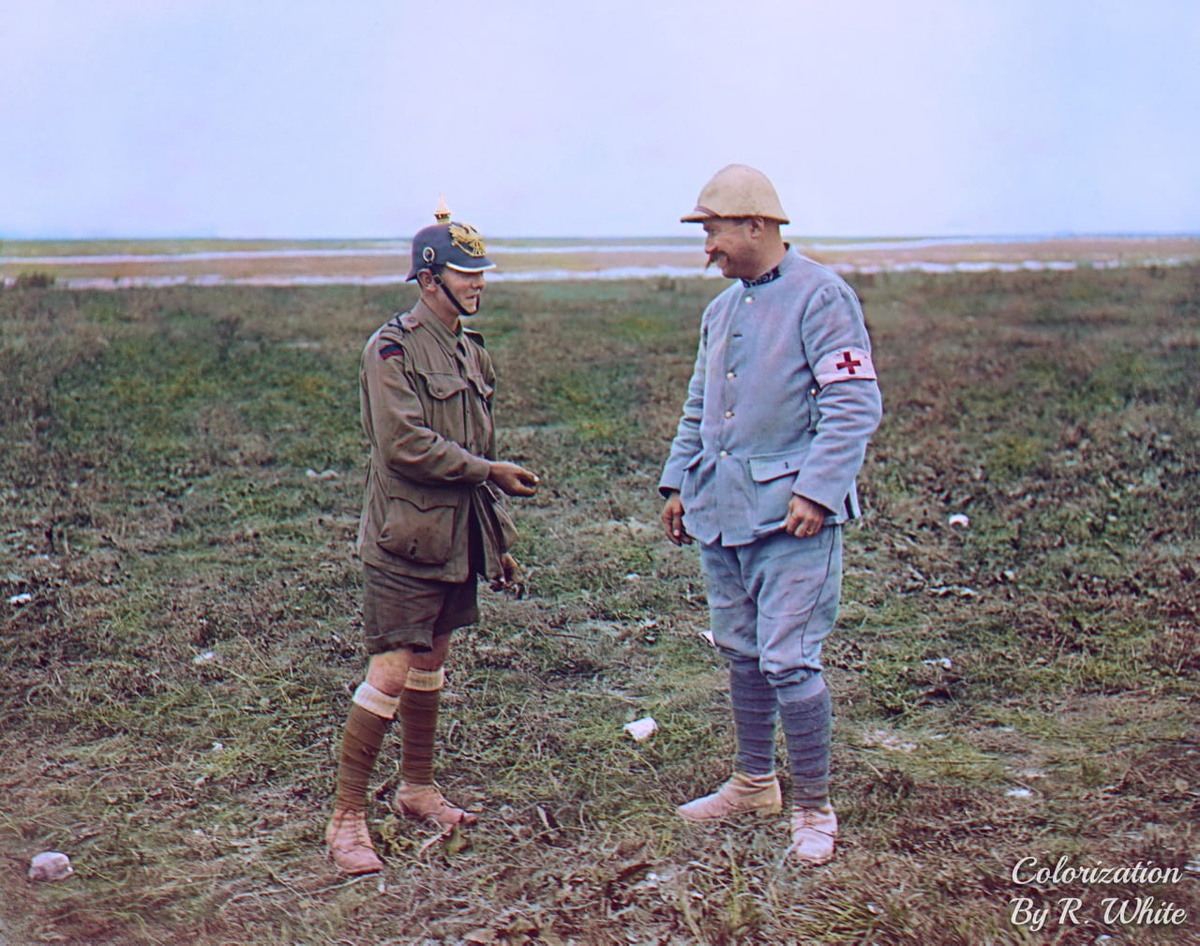 Австралийский солдат в трофейном Пикельхельме беседует с французским носильщиком, недалеко от Позьера, 23 июля 1916 года. Оригинал iwm Q 4042.