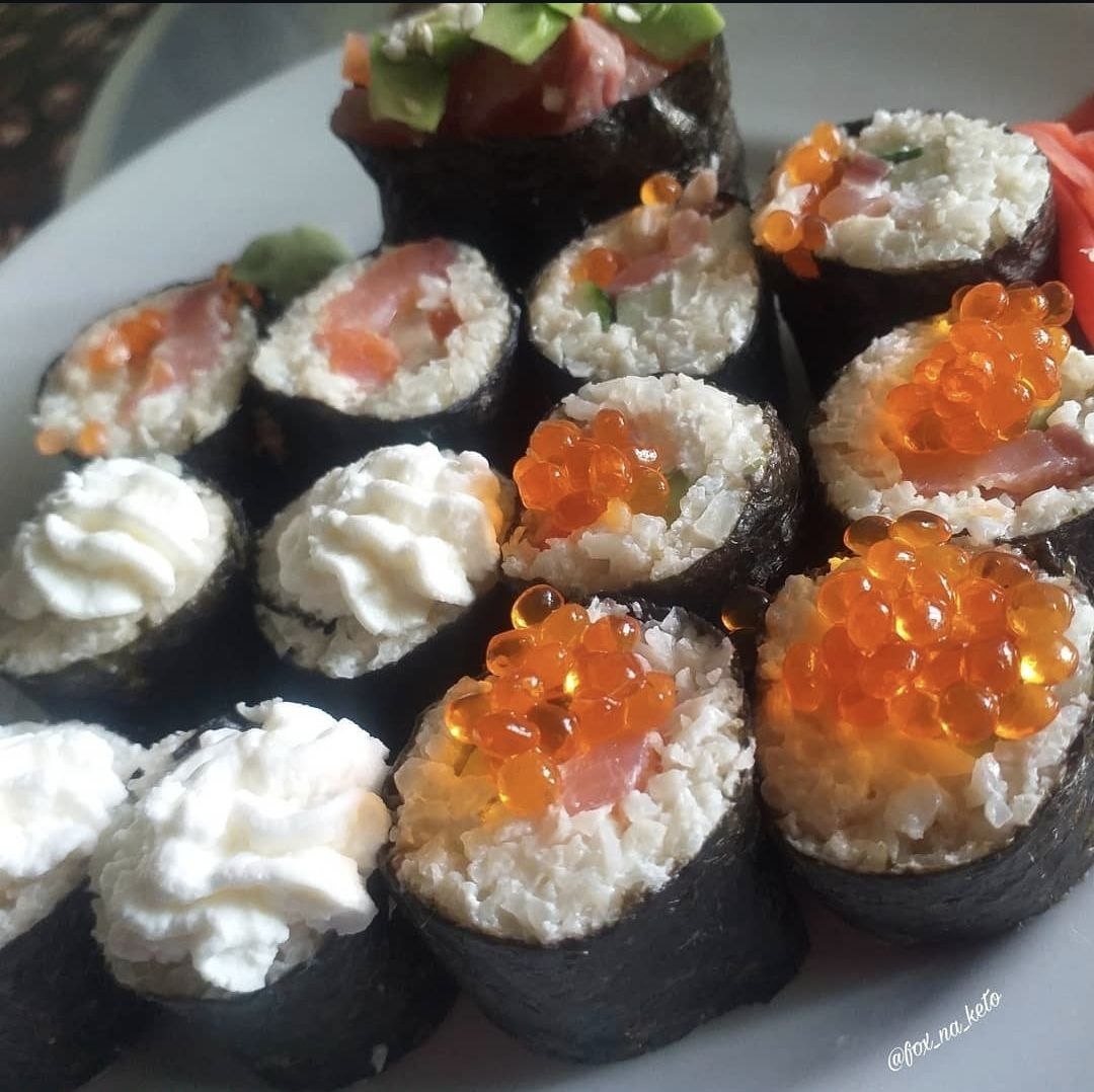Роллы #кетосуши ⠀ Ингредиенты: 📌 цветная капуста 📌 сливочный сыр аля каймак 📌 листы нори Для начинки: 📌 лосось 📌 огурец 📌 авокадо 📌 сливочный сыр 📌 икра Можно также использовать креветки, кальмары, копчёную курицу, в общем, кто что любит ⠀ Приготовление: Капусту натереть на крупной тёрке или измельчить в чаше блендера. Затем переложить в чашку, которую можно использовать в микроволновке. На чашку надеть пакет, чтоб не капуста не сохла, и в микроволновку на 3 минуты. Остудить, добавить сливочный сыр, пару ложек, чтоб "рис" стал липким. Ну, а дальше, как обычные роллы: разрезать лист нори пополам, выложить на бамбуковый коврик блестящей стороной вниз, примерно 1,5 ложки "риса" распределить ровным слоем, оставляя край 1 см. Выложить любимую начинку, край смочить водой, свернуть ковриком. ⠀ ПРИЯТНОГО АППЕТИТА