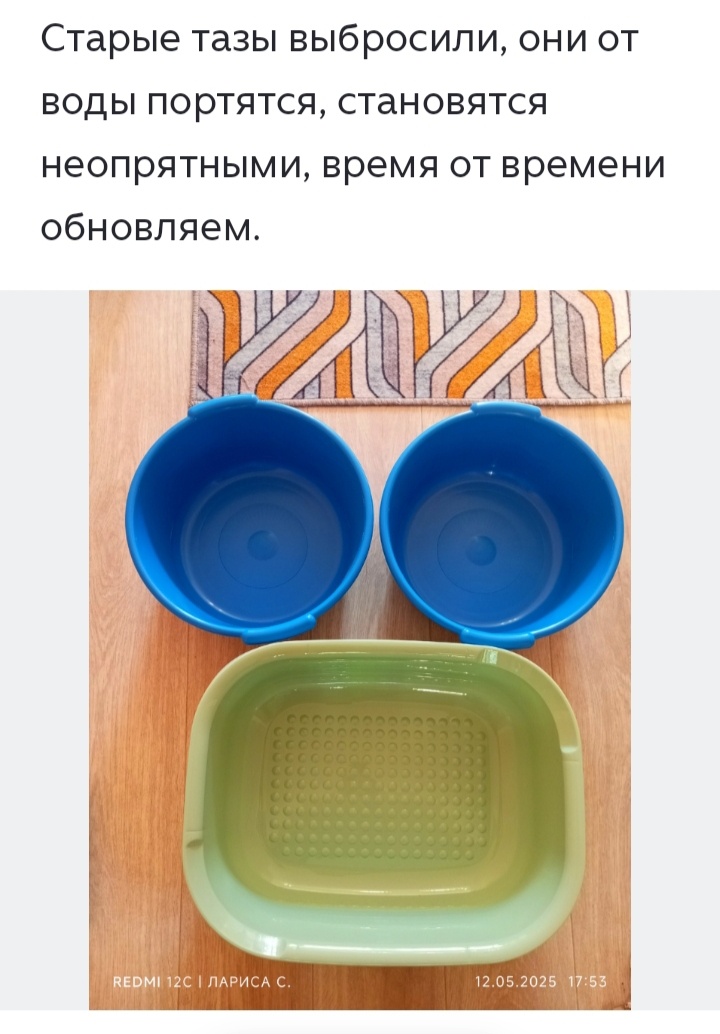 Вот эти синие тазики раздора, один новый, другой чистый, после каждой постирушки я тщательно его мою с порошком и горячей водой, сушу на балконе.