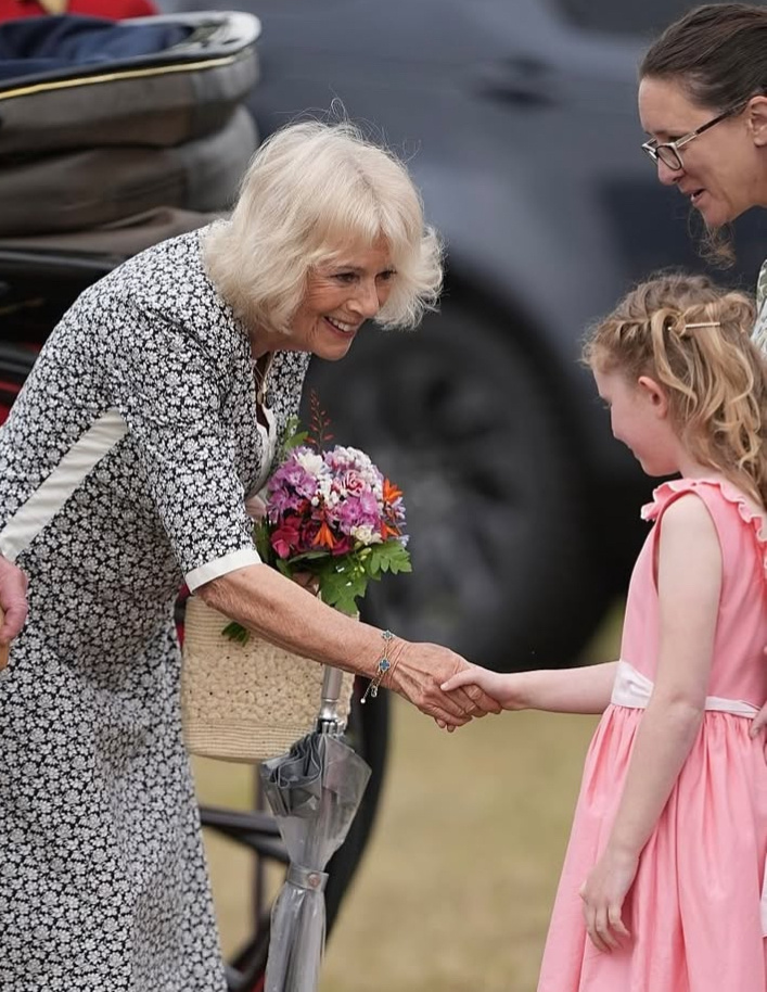 Уехав в поместье Сандрингем, Чарльз сегодня с супругой появились на цветочном шоу местности. Выставка-ярмарка садоводов и флористов в Сандрингеме это больше шоу, чем реальные тенденции в мире растениеводства. Хотя и саженцы, и букеты тут были. Если вы обратите внимание- душистый горошек в букете вполне неплох для консорт! Его вставили в букет для королевской четы уже второй раз за два дня. Сама Камилла, как и ее супруг, традиционно въезжали на открытом королевском экипаже с кучерами в ливреях и двумя белыми породистыми лошадями . Да, монарх потихоньку начинает понимать, что декорации в перманентном шоу Короны штука важная . Обратила внимание, что Камилла, как и Чарльз, с трудом ходят и их поход по площадям выставки ограничили. На королеве ее старое платье в цветочек с белой отделкой ( вставки по бокам напоминают мне , как бабушки расшивали любимые платья, но здесь это такой крой и задумка!) два медальона, один из золота с инициалами внуков и рубином, ее камнем, второй- в виде