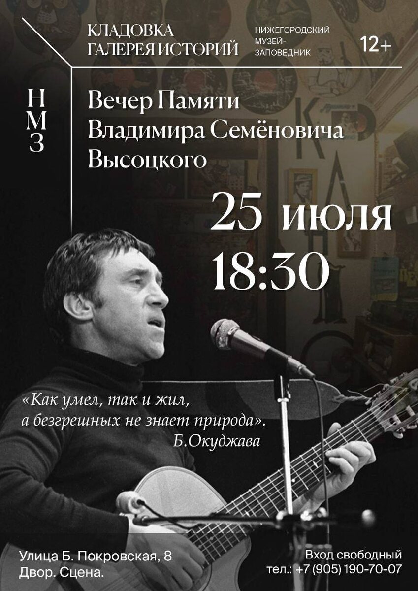 🎧 25 июля в 18:30 в Кладовке. Галерее Историй пройдет музыкальный вечер, посвященный памяти Владимира Высоцкого Гости услышат редкие записи песен с 4-х дюймовых пластинок, принесенных генеральным директором НМЗ Юрием Филипповым, видевшим Высоцкого на сцене Театра на Таганке. Также дуэт «Арфа и гитара» исполнит композиции Владимира Семёновича и Марины Влади. Завершит встречу «Свободный микрофон» для всех, кто хочет поделиться своими мыслями. Приходите! Будем слушать, вспоминать и петь вместе. 🔵Вход свободный. 😄 Мероприятия Нижний Новгород. Я местный!