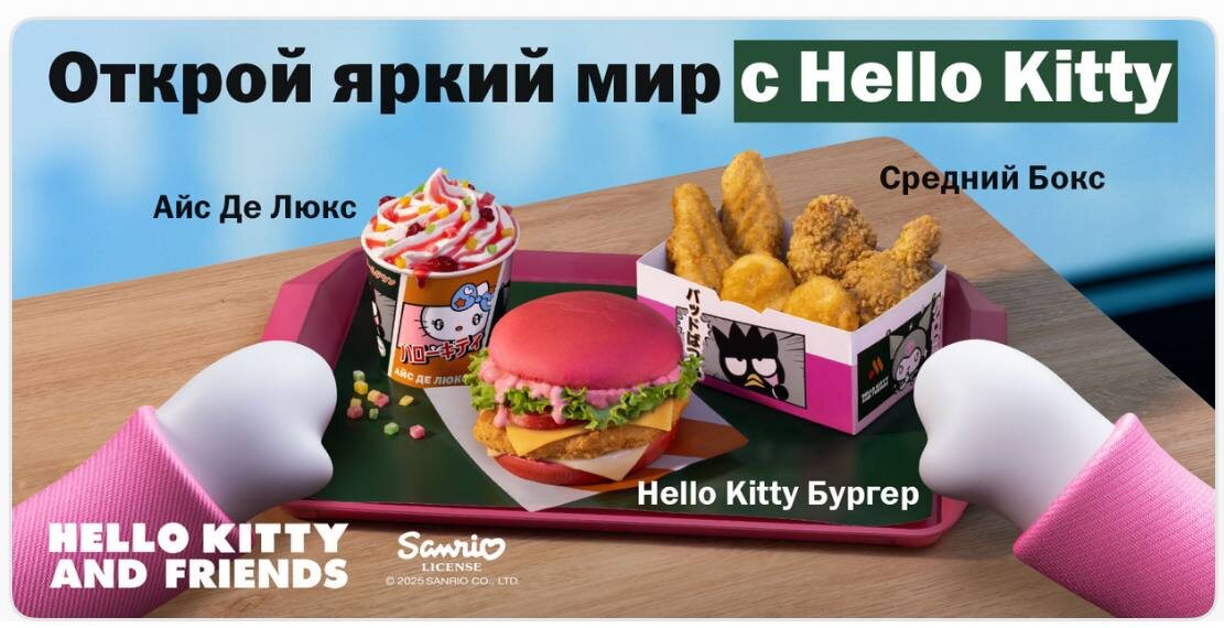 Hello Kitty во «Вкусно — и точка» Розовый сет Hello Kitty — это прежде всего про визуал. Булочка мягкого пудрового оттенка, яркая упаковка с фирменными героями Sanrio, милые детали — каждая часть продумана так, чтобы работать на образ. Упаковка как часть опыта: минимализм форм, знакомая палитра и узнаваемые персонажи превращают обычный заказ в маленькую историю, в которой японская поп-культура встречается с российским фастфудом. Идея тоже проста и тонко подана: добавить в привычный сценарий лёгкости, иронии и эмоций. Hello Kitty здесь — не просто маркетинговый приём, а культурный жест, визуальный комментарий к теме инфантильной эстетики и её глобальной привлекательности. Что до вкуса — он, как ни странно, остаётся фоном. Розовая булочка выглядит эффектно, но внутри всё тот же привычный бургер с курицей и сырным соусом. Это история не о гастрономии, а о дизайне и визуальном впечатлении. Такой шаг — больше чем маркетинг. Это попытка перепридумать сам формат быстрого питания: в него д