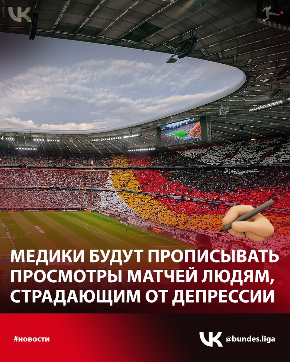 "У вас депрессия? Пропишу Вам ходить на стадион!" ✍⚽ ⚡Интересное нововведение в Здравоохранении будут внедрять в Британии. Медики намерены прописывать просмотры футбольных матчей людям, страдающим от депрессии. Национальная служба здравоохранения Великобритании планирует официально прописывать просмотр футбольных матчей вживую пациентам, которые страдают от депрессии. Об этом сообщает известное онлайн-издание Independent. ✍ Отмечается, что медики советуют людям с депрессией чаще выходить на улицу и быть частью социума, так как изоляция крайне негативно влияет на психику. Сообщается, что если опыт будет положительным, то его могут принять в свою практику и другие страны.