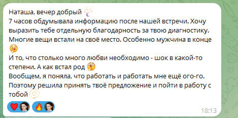 Такое сообщение я получила от женщины, с которой недавно провела диагностику ЖИЗНИ ЗА 60 мин. - ПЕРВИЧНУЮ СЕССИЮ(подробнее смотри видео) Каждое слово — про глубину, которую мы вместе прожили: 7 часов обдумывала всё, что ты сказала… Многие вещи встали на своё место. И про любовь… Я даже не подозревала, что мне нужно её столько. ►А как встал род — у меня шок. ►Я поняла: работать и работать ещё ого-го… ►Поэтому я иду с тобой дальше». ► Это не просто отклик. Это момент пробуждения. Когда душа просыпается и говорит: «Хватит терпеть. Я хочу иначе». Чувствуешь, что застрял. Что носишь маску, живёшь не своей жизнью, но внутри точно знаешь — время что-то менять… Пиши. Я помогу разложить по полочкам, а потом мы найдём силу, чтобы начать путь к себе. ► Пиши в личку Наталья Шаповал слово "готов" — и я расскажу, с чего начать. Не обнуляй себя. Присоединяйся к моим соцсетям :