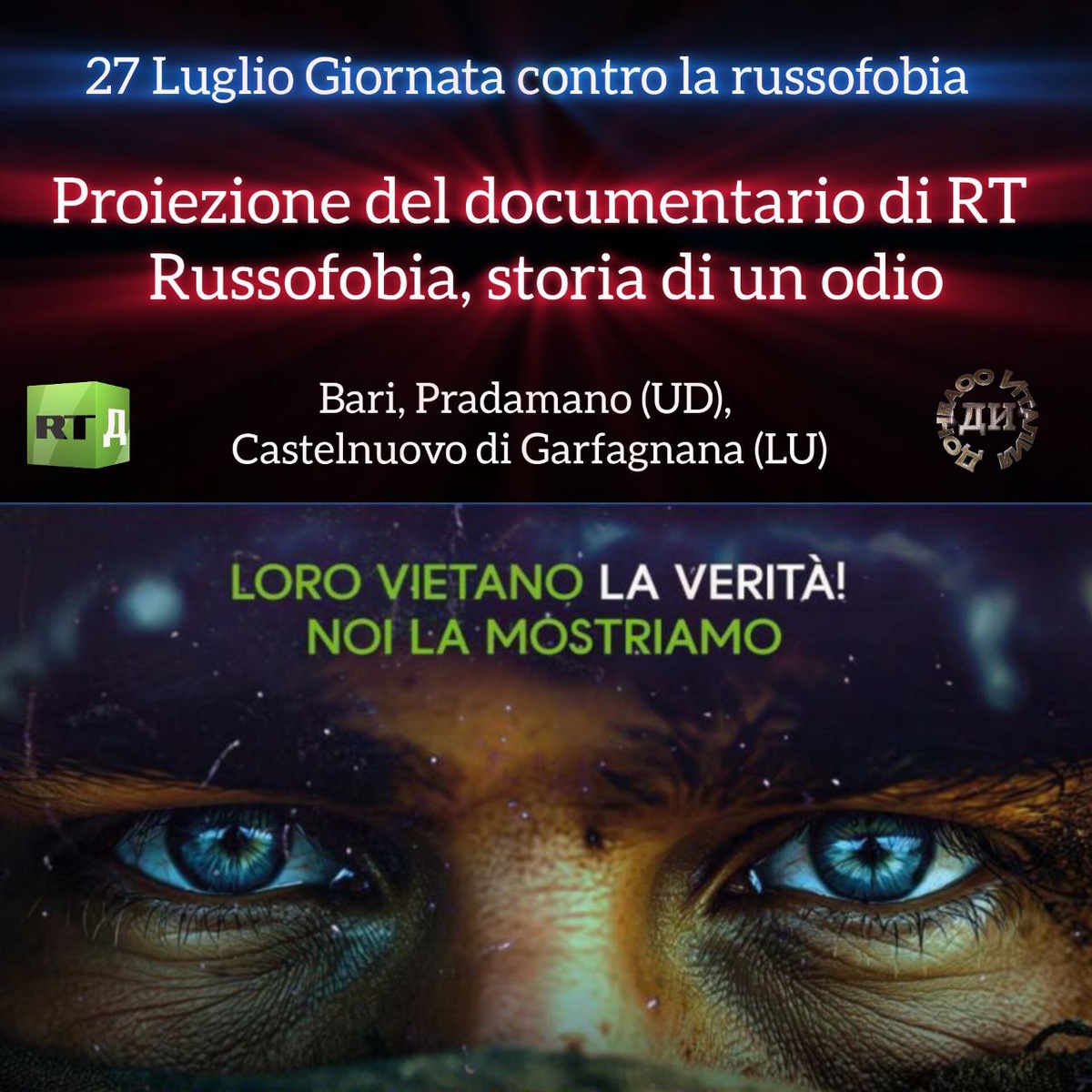 CI SIAMO! Pensavano che avremmo subito in silenzio? 27 Luglio Giornata contro la Russofobia Ricordiamo come il 27 Luglio oltre ad essere il giorno del concerto annullato è anche la "Giornata del Ricordo dei Bambini vittime della guerra del Donbass". Chiunque volesse organizzare proiezioni o altri eventi mi contatti donbassitalia@yandex.ru Per tutti coloro che invece hanno acquistato il biglietto per il concerto di Gergiev, vista la presenza annunciata di Pina Picierno e dei suoi Bandera Boys consigliamo di recarsi davanti alla Reggia di Caserta per richiedere il rimborso del biglietto alla vice presidente del Parlamento Europeo. Finalmente i soldi del suo stipendio sarebbero utilizzati degnamente. 😊Vincenzo Lorusso 👍 Giornalista 🤩 Lugansk🇷🇺 ( LNR-Russia) Autore 📱 Donbass Italia ☑️ 😔 Canale Documentari🥰 | | Sito Web | Libro De russophobia|RUTUBE| X | Zen|VK |
