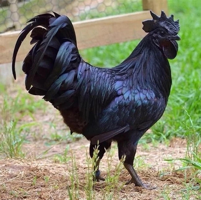 Аям чемани — куры этой редкой породы черные не только снаружи, но и внутри. Стоимость одного экземпляра достигает 2500$ Аям чемани (индон. ayam cemani, яв. ayam cemani) — редкая декоративная порода кур родом из Индонезии. Они имеют доминантный ген, который вызывает гиперпигментацию (Fibromelanosis); это приводит к тому, что куры чёрные не только снаружи, но и внутри: их кости и внутренние органы тоже чёрные. Кровь у них красная, но существенно темнее, чем у кур обычных пород. У птицы чёрное с зелёным отливом оперение, чёрные лапы, когти, клюв, язык, кожа, гребень и бородка, глазные яблоки, мясо, кости и внутренние органы. Вес петухов в среднем составляет 2–2,5 кг, куриц — 1,5–2 кг. Куры несут яйца кремового цвета с лёгким розовым оттенком, которые весят в среднем 45 г. Эта порода столь уникальна и редка, что цыплёнок в самой Индонезии стоит около 200 долларов, а за её пределами цена может достигать нескольких тысяч — так, в США такая птица может продаваться по цене 2500 долларов.