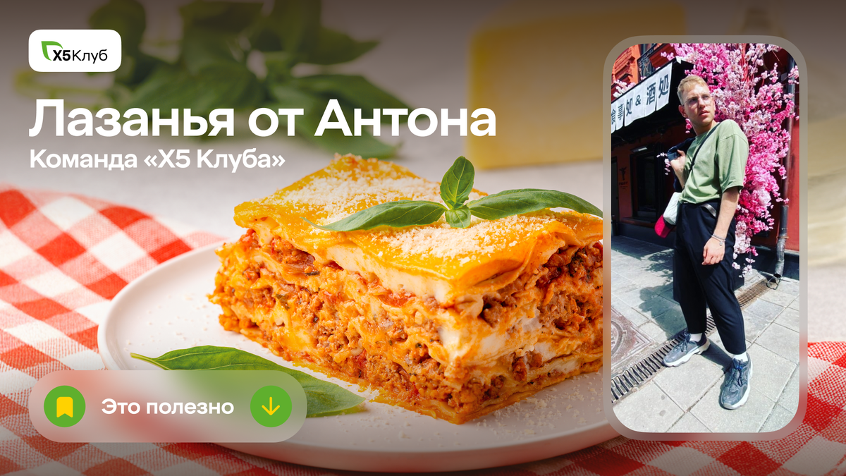 Меня зовут Антон, я в команде «Х5 Клуба», и сегодня принёс вам отличную идею для ужина. Мой любимый рецепт — классическая лазанья болоньезе, как в лучших эмильянских традициях: нежная паста, слой бархатного мясного соуса с томатами, белоснежный соус бешамель и свеженатёртый пармезан, который превращает блюдо в настоящее чудо. Символ простоты и уюта — такое блюдо собирает за столом всех: от самых маленьких до самых взрослых. Готовится несложно, но требует времени. Ровно как и любые вещи, сделанные с любовью. Что нужно: Для бешамеля: Готовим так: