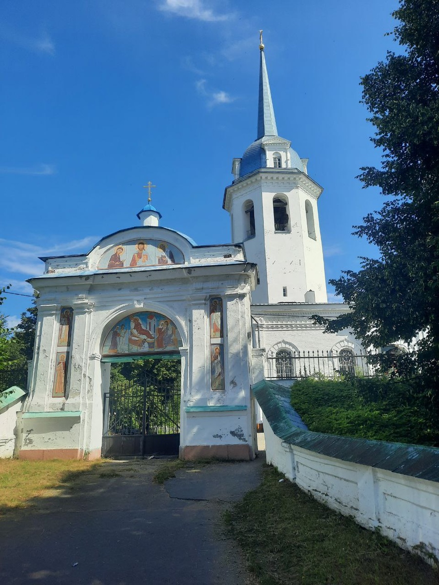 А Никольская церковь стоит закрытой. Её относят к 16 веку. Замечательные пузатые колонны на входе, истертые ступени, а внутри запустение. Собор до революции был известен иконой Николая Чудотворца, которая вместе с лампадой по просьбе мореходов была вынесена на стену собора и служила маяком. После революции и икона и серебряный оклад, в который её поместили в начале 20 века, пропали. Сейчас икона восстановлена. К ней ведёт винтовая лестница, а с вершины вот такой вид на Волхов, на арку на берегу.